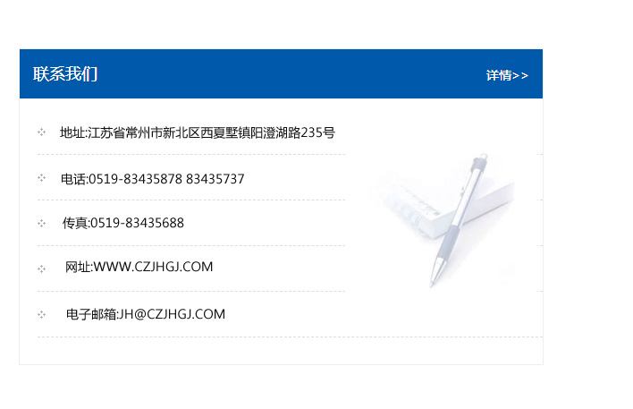地址:常州市新北區友邦商務大廈1幢16、17層  電話:0519-85101652  傳真:0519-85112595  郵編:213022  網址:www_cz-jiayue_cn.tsghongmu.com  郵箱:xiajifengaa@163.com
